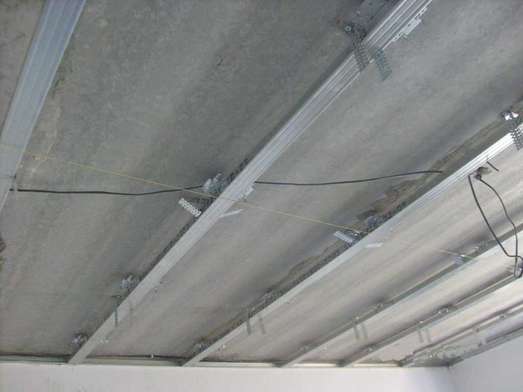 - Когда мы смотрим монтаж подвесного потолка из гипсокартона – видео ролик показывает, что профили нивелируются длинным строительным уровнем, но это не совсем удобно, так как точно выставить плоскость ним достаточно сложно. Гораздо легче это сделать, натянув под каркасом обыкновенную капроновую нитку.