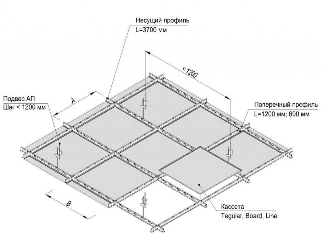 |   Кассета или плита | Это основная часть кассетного потолка, отвечающая за его внешний вид. Кассета изготавливается чаще всего из металла и имеет форму квадрата. Размеры могут быть разными, от 30*30 до 90*90 см. |