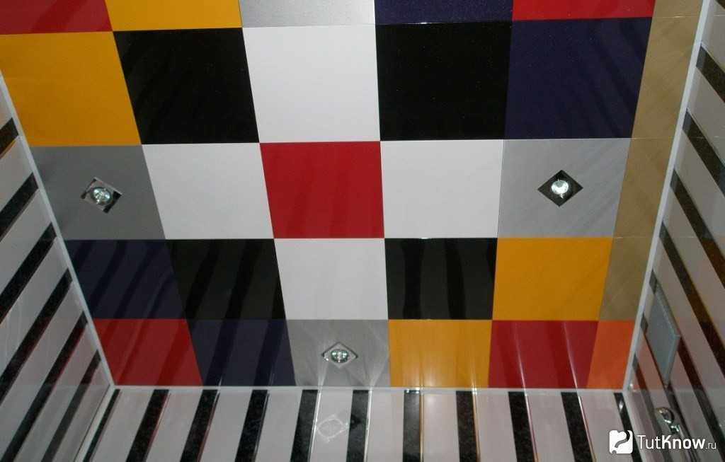 - Потолки имеют огромный выбор цветов и различных фактур — от матовой поверхности до зеркального блеска.