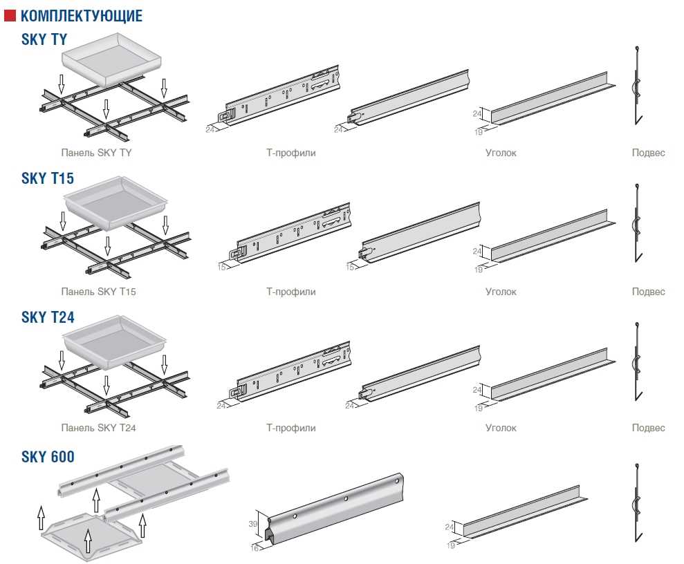 Кассетный алюминиевый потолок в комплекте имеет следующий состав: