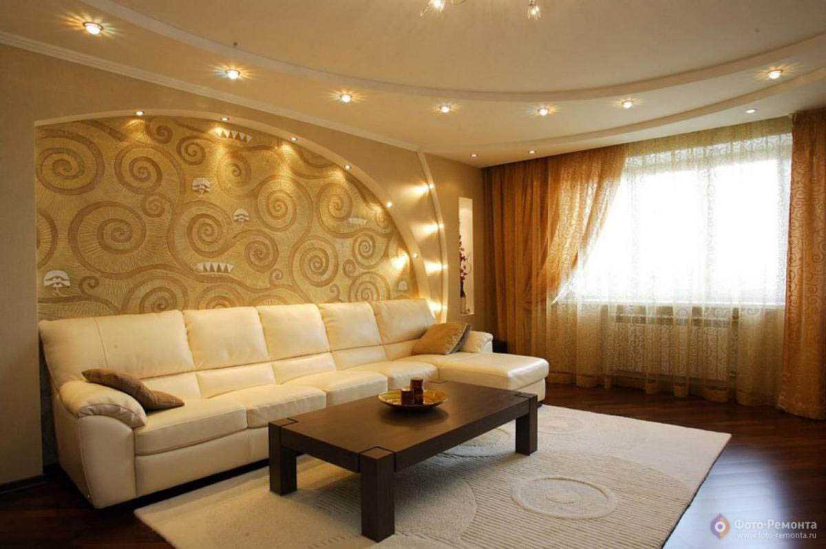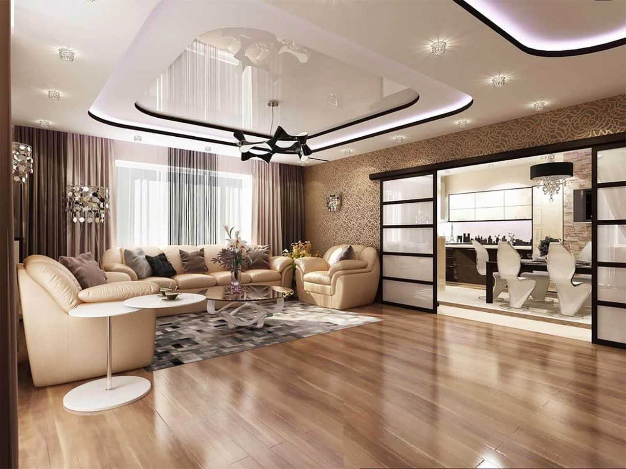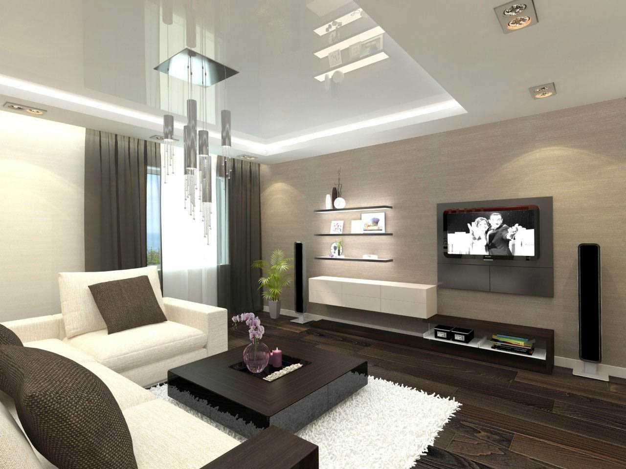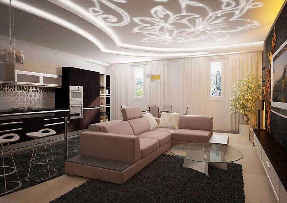 - дефицит свободного пространства в гостиной прекрасно решается использованием потолка из гипсокартона на тон светлее, чем стены;