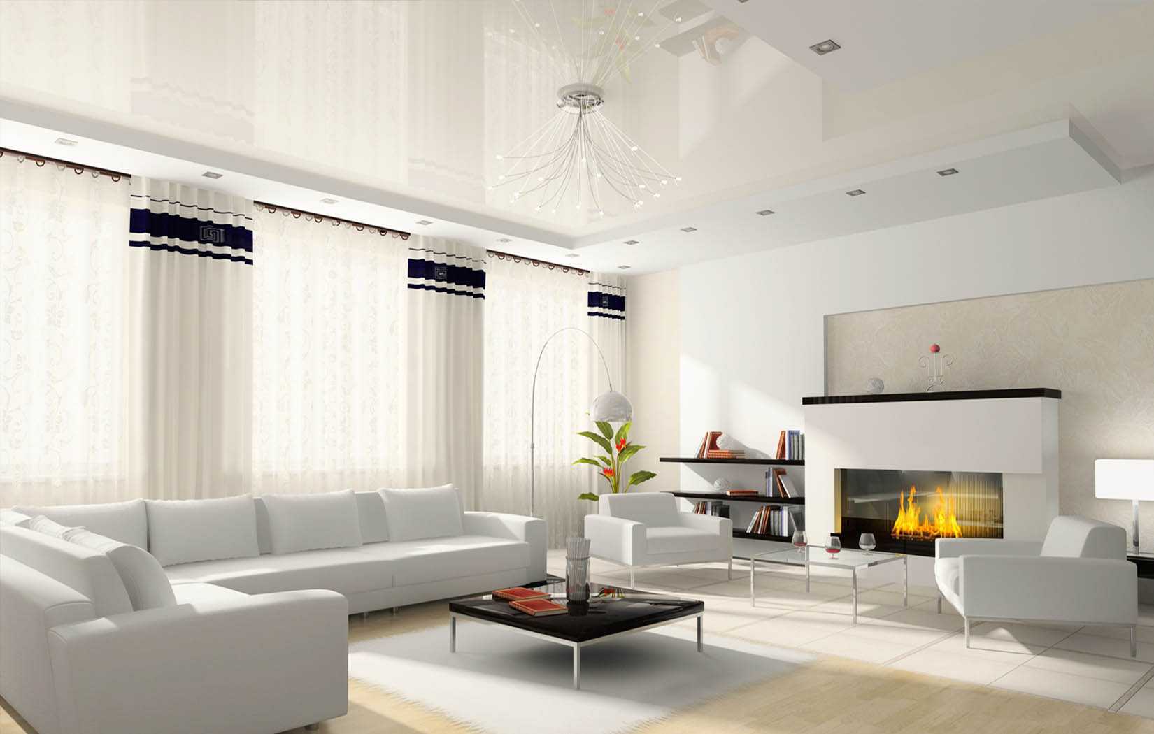 - белый и черный — универсальные цвета из базовой палитры для потолка, которые прекрасно сочетаются с любыми оттенками — однако стоит ограничивать их использование в интерьере разумным балансом с другими цветами: сочетание белых стен и аналогично выбеленного потолка может привести к «больничному» эффекту, а полярное взаимодействие черных стеновых поверхностей с таким же черным потолком станет причиной создания мрачного и давящего на психику психоделического интерьера — о какой уж тут семейной гармонии может идти речь?