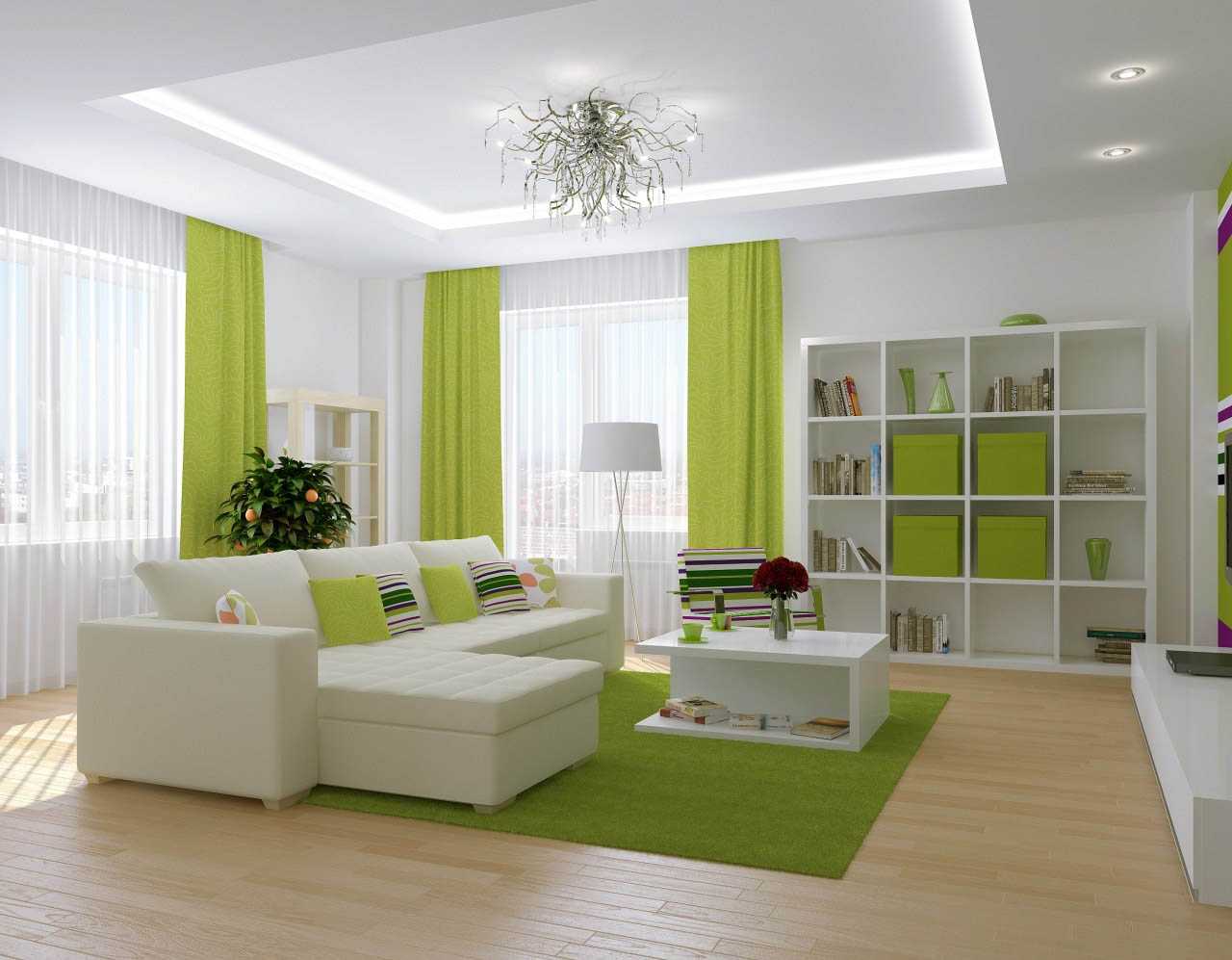 - если окна в вашей гостиной выходят на южную сторону, то потолки из гипсокартона можно смело оформлять в голубом, сером или зеленом цвете — так вы получите более воздушную и сбалансированную атмосферу в интерьере;