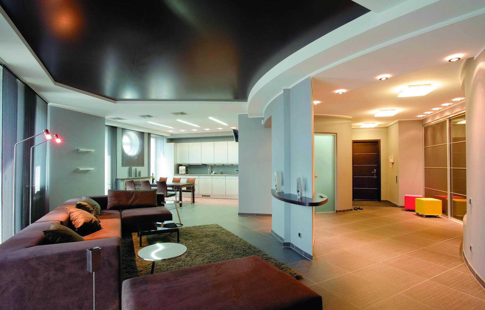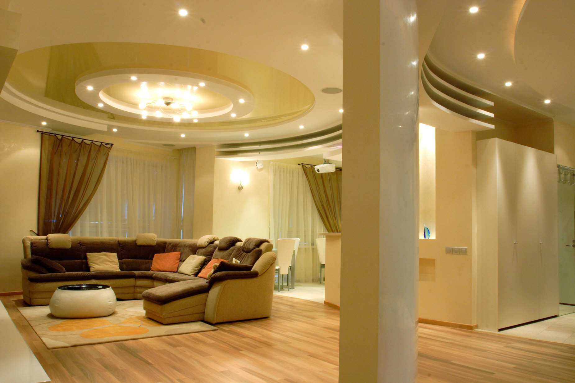 Простор фантазии в этом плане предоставляют многоуровневые фигурные потолки. Они позволяют устанавливать любые светильники в любом количестве. Правильное освещение помогает визуально разбить комнату на условные зоны с разными функциональными особенностями.