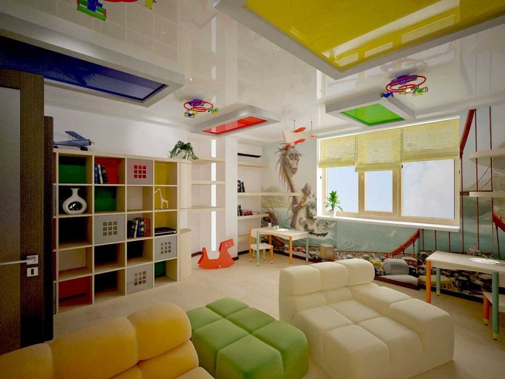 Внимание: Если вы остановились на многоцветном потолке сложной конструкции, остальной интерьер должен быть выдержан в сдержанных тонах. Иначе детская получиться слишком пестрая и ребенок будет быстро в ней уставать