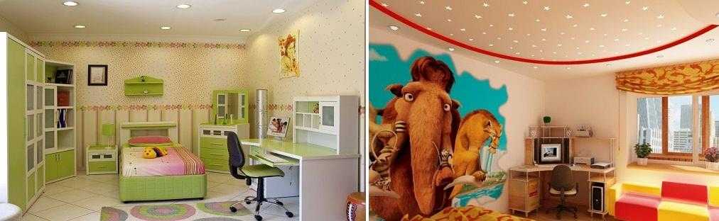 - осуществление монтажа освещения в детской с натяжными потолками с использованием светильников разного типа, например, точечных;