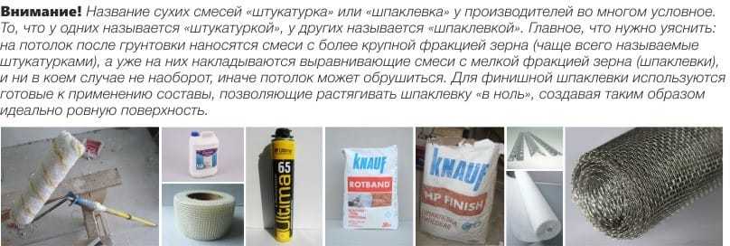 Перепады потолка-основания в 3-5 см требуют более серьезных мер — применения металлической армирующей сетки, закрепленной к бетону потолочными дюбелями и выдерживающей большое наслоение штукатурки из цементно-песчаной смеси (Ротбанда). После того как штукатурка высохнет можно приступать к шпатлеванию.