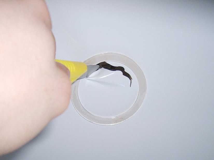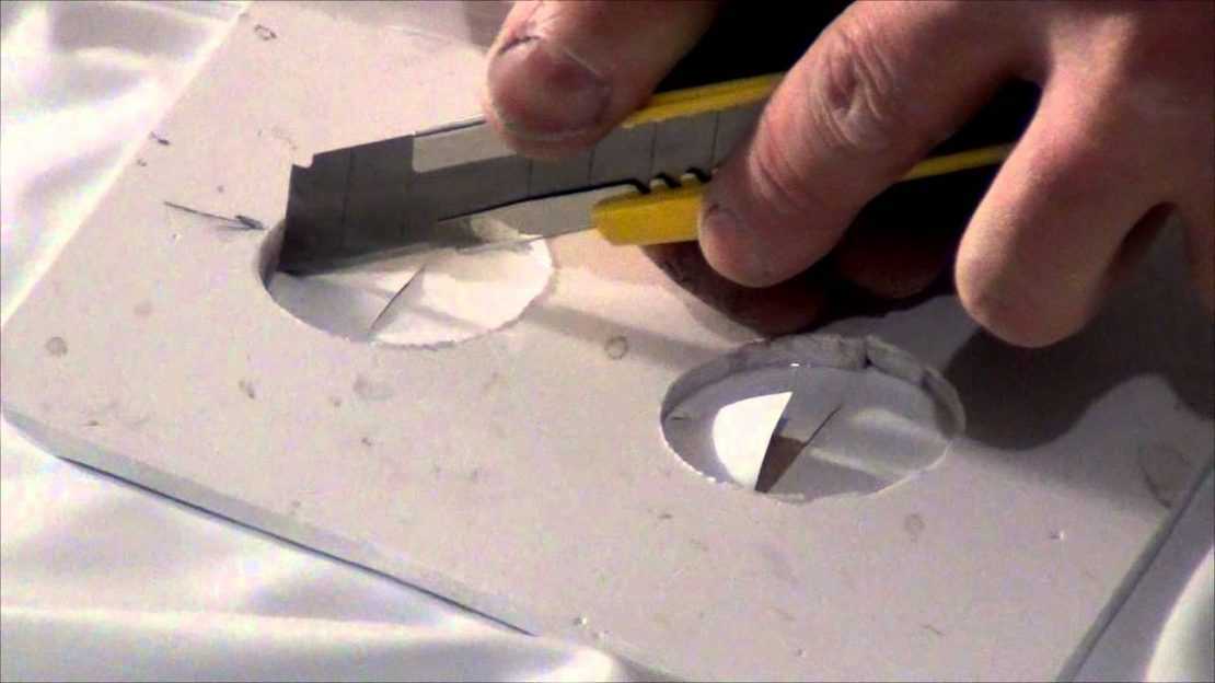 Размеры отмечают на листе ПВХ карандашом. Маленькое усилительное кольцо можно высверлить дрелью со специальной насадкой. Более крупные аккуратно вырезают острым монтажным ножом, а затем подравнивают внутреннюю сторону.