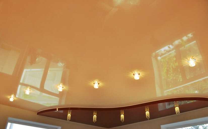 Плёнка нагревается не только при монтаже, но и от неправильно подобранных осветительных приборов. Лампы накаливания не годятся, выбирают энергосберегающие, галогенные или светодиодные. Но их должно быть не слишком много. Приборы монтируют с установкой термопротектора (пластикового кольца).
